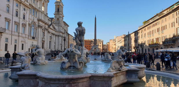 Après être enfin arrivé à l'hôtel, nous avons commencé notre visite de Rome. Direction la Piazza Novana avec sa fameuse fontaine Dei Quattro Fiumi sur laquelle on peut trouver une des nombreuses obélisques qui se cache dans toute la ville. Cette fontaine représente allégoriquement les fleuves des grands continents: le Gange en Asie, le Nil en Afrique, le Danube en Europe et le Rio de la Plata en Amérique.
